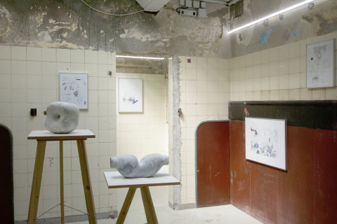 Im urbanen Raum entstehen permanent architektonische und soziale Grenzen zwischen Innen und Außen, Öffentlichem und Privatem. Die ortsspezifische Thematik des wohl intimsten Ortes, der im öffentlichen Raum zu finden ist, wird in der Ausstellung meet me being private szenisch, skulptural und zeichnerisch aufgegriffen.