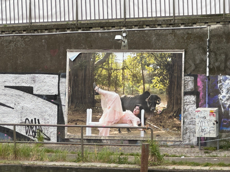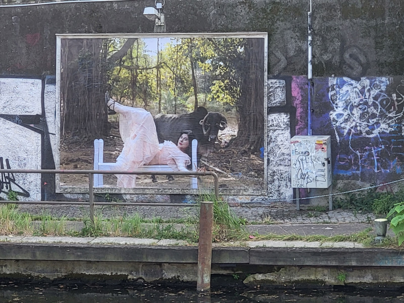 In Daydream Mumbai Ekici is with the camera team on Elephanta Island near Mumbai, India. There are many stairs, 120 steps in total, up to the temple where she wants to do her video performance at the temple. Once at the top, she was refused permission to be filmed on the white bench in front of the temple. So she went back down the stairs with her camera team and discovered a field with cows and an ox. An ideal location for the film shoot.